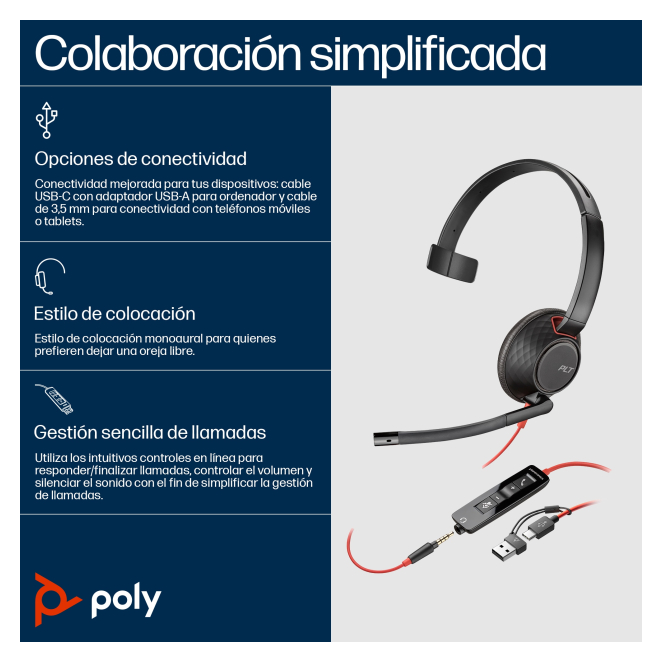 Poly Auriculares Blackwire 5210 monaural USB-C + conector de 3,5 mm + adaptador USB-C/A (paquete)