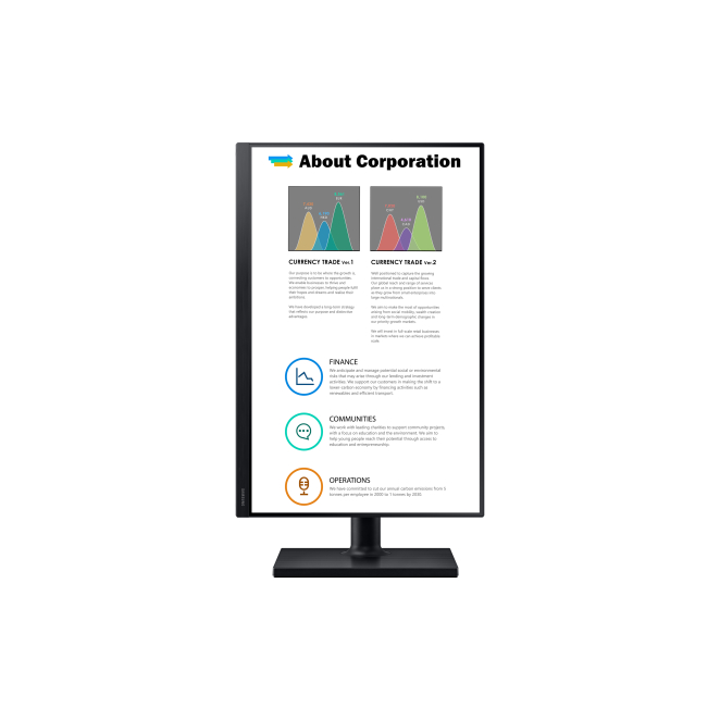 Samsung T45F pantalla para PC de 61 cm (24 pulgadas), resolución 1920 x 1200 Pixeles WUXGA, color Negro, LF24T450GYUXEN Financiado desde: 8,50 € /mes Stock disponible en nuestros almacenes Métodos de pago: Solicita información en caso de necesitar envío urgente. Samsung T45F pantalla para PC 61 cm (24″) 1920 x 1200 Pixeles WUXGA LCD Negro La pantalla para PC Samsung T45F es la solución perfecta para profesionales que buscan una experiencia visual de alta calidad. Con una diagonal de pantalla de 61 cm (24 pulgadas) y una resolución de 1920 x 1200 píxeles, este monitor ofrece imágenes claras y detalladas. Gracias a su tecnología WUXGA y panel IPS, podrás disfrutar de colores vivos y un amplio ángulo de visión de 178°, tanto horizontal como verticalmente. Además, con un tiempo de respuesta de 5 ms y un brillo típico de 250 cd/m², el monitor Samsung T45F garantiza una visualización nítida y sin retrasos. El monitor Samsung T45F ofrece una serie de ventajas que lo hacen ideal para cualquier entorno profesional: El monitor Samsung T45F es ideal para usuarios profesionales que requieren una pantalla de alta calidad para tareas complejas. Diseñadores gráficos, videógrafos, programadores y analistas de datos se beneficiarán de su alta resolución y fidelidad de color. Además, los profesionales que necesitan una mayor comodidad visual durante largas sesiones de trabajo apreciarán su tecnología Flicker Free y el modo Eye Saver de Samsung, que reduce la luz azul y la fatiga ocular. La pantalla Samsung T45F garantiza una experiencia de usuario cómoda y productiva. Gracias a su capacidad de ajuste en altura y su soporte VESA, puedes posicionar el monitor exactamente como lo necesites. La relación de aspecto de 16:10 ofrece más espacio vertical para ver más contenido al mismo tiempo. Además, sus altavoces incorporados permiten una solución de audio integrada, eliminando la necesidad de altavoces adicionales. El Samsung T45F es una excelente opción por varias razones: A continuación, encontrarás las preguntas frecuentes sobre el monitor Samsung T45F: El Samsung T45F utiliza tecnología de visualización LCD con un panel IPS para ofrecer excelentes ángulos de visión y calidad de imagen. El monitor Samsung T45F con soporte tiene unas dimensiones de 534 mm de ancho, 224 mm de profundidad y 386.3 mm de altura. Sí, el Samsung T45F es compatible con montajes VESA de 100 x 100 mm. El Samsung T45F ofrece conectividad versátil con puertos HDMI 1.4, DisplayPort 1.2 y varios puertos USB. Sí, el monitor Samsung T45F cuenta con altavoces integrados para una solución de audio conveniente. Diagonal de la pantalla 24 " Resolución de la pantalla 1920 x 1200 Pixeles Tipo HD WUXGA Relación de aspecto nativa 16:10 Relación de aspecto 16:10 Tecnología de visualización LCD Tipo de pantalla IPS Pantalla táctil No Brillo de la pantalla (típico) 250 cd / m² Tiempo de respuesta 5 ms Forma de la pantalla Plana Razón de contraste (típica) 1000:1 Máxima velocidad de actualización 75 Hz Ángulo de visión, horizontal 178 ° Ángulo de visión, vertical 178 ° Número de colores de la pantalla 16,7 millones de colores Tamaño visible, horizontal 518.4 mm Tamaño visible, vertical 324 mm Diagonal de pantalla 61 cm Cobertura NTSC (típica) 72 % NVIDIA G-SYNC No AMD FreeSync No Tecnología Flicker free (reduce el parpadeo de la pantalla) Sí Modo de juego Sí Altavoces incorporados Sí Cámara incorporada No Posicionamiento de mercado Profesional Color del producto Negro Color de pies Negro Conector USB incorporado Sí Puerto DVI Sí Versión de conector USB 2.0 / 3.2 Gen 1 (3.1 Gen 1) Cantidad de puertos USB descendentes de tipo A 4 HDMI Sí Número de puertos HDMI 1 Versión HDMI 1.4 Cantidad de DisplayPorts 1 Versión de DisplayPort 1.2 Salida de auriculares Sí montaje VESA Sí Interfaz de panel de montaje 100 x 100 mm Ajustes de altura Sí Altura ajustable (máx.) 130 mm Eje Sí Ángulo de pivote -2-92 ° Giratorio Sí Ángulo de giro (alcance) -45-45 ° Ajuste de la inclinación Sí Ángulo de inclinación -3-25 ° Exhibición en pantalla (OSD) Sí Clase de eficiencia energética (SDR) D Clase de eficiencia energética (HDR) No disponible Consumo de energía (SDR) por 1000 horas 14 kWh Consumo energético 14 W Consumo de energía (inactivo) 0.5 W Consumo de energía (apagado) 0.3 W Voltaje de entrada AC 100 - 240 V Frecuencia de entrada AC 50/60 Hz Tipo de fuente de alimentación Externo Escala de eficiencia energética De la A a la G Código EPREL (Registro europeo de productos para el etiquetado energético) 755328 Intervalo de temperatura operativa 10-40 °C Intervalo de humedad relativa para funcionamiento 10-80 % Ancho del dispositivo (con soporte) 534 mm Profundidad dispositivo (con soporte) 224 mm Altura del dispositivo (con soporte) 386.3 mm Peso (con soporte) 5500 g Ancho (sin base) 534 mm Profundidad (sin base) 44.9 mm Altura (sin base) 354.5 mm Peso (sin base) 4100 g Ancho del paquete 611 mm Profundidad del paquete 419 mm Altura del paquete 153 mm Peso del paquete 7200 g Tipo de embalaje Caja Stand incluido Sí Cables incluidos Corriente alterna, HDMI, USB Longitud del cable HDMI 1.5 m Cumplimiento de sostenibilidad Sí Certificados de sostenibilidad ENERGY STAR, TCO