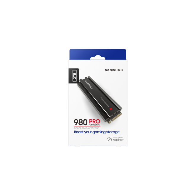 Samsung 980 Pro 2 TB en empaque junto a su presentación vertical