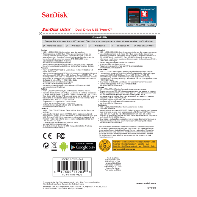 Si tienes dudas sobre la SanDisk Ultra Dual Drive USB Type-C, a continuación respondemos algunas de las preguntas más frecuentes: Sí, su interfaz dual USB Type-A y USB Type-C la hace compatible con una amplia variedad de dispositivos, incluyendo computadoras y teléfonos móviles. Esta unidad flash ofrece una velocidad de lectura de hasta 150 MB/s gracias a su versión USB 3.2 Gen 1 (3.1 Gen 1), proporcionando una transferencia de datos rápida y eficiente. La SanDisk Ultra Dual Drive USB Type-C tiene una capacidad de 32 GB, ideal para almacenar grandes cantidades de datos. Sí, su diseño con el factor de forma deslizante protege los conectores, ofreciendo una mayor durabilidad y resistencia al uso diario. Sí, esta unidad flash es compatible con dispositivos Mac, ofreciendo una solución de almacenamiento versátil para usuarios de Apple. Factor de forma Deslizar Color del producto Negro, Plata Sistema operativo Windows soportado Windows 10 Education, Windows 10 Education x64, Windows 10 Enterprise, Windows 10 Enterprise x64, Windows 10 Home, Windows 10 Home x64, Windows 10 Pro, Windows 10 Pro x64, Windows 7 Enterprise, Windows 7 Enterprise x64, Windows 7 Home Basic, Windows 7 Home Basic x64, Windows 7 Home Premium, Windows 7 Home Premium x64, Windows 7 Professional, Windows 7 Professional x64, Windows 7 Starter, Windows 7 Starter x64, Windows 7 Ultimate, Windows 7 Ultimate x64, Windows 8, Windows 8 Enterprise, Windows 8 Enterprise x64, Windows 8 Pro, Windows 8 Pro x64, Windows 8 x64, Windows Vista Business, Windows Vista Business x64, Windows Vista Enterprise, Windows Vista Enterprise x64, Windows Vista Home Basic, Windows Vista Home Basic x64, Windows Vista Home Premium, Windows Vista Home Premium x64, Windows Vista Ultimate, Windows Vista Ultimate x64 Sistema operativo MAC soportado Mac OS X 10.10 Yosemite, Mac OS X 10.11 El Capitan, Mac OS X 10.12 Sierra, Mac OS X 10.13 High Sierra, Mac OS X 10.6 Snow Leopard, Mac OS X 10.7 Lion, Mac OS X 10.8 Mountain Lion, Mac OS X 10.9 Mavericks Ancho 38.1 mm Profundidad 9.4 mm Altura 20.07 mm Peso 9.1 g Peso del paquete 28.3 g Intervalo de temperatura operativa 0-45 °C Intervalo de temperatura de almacenaje -10-70 °C