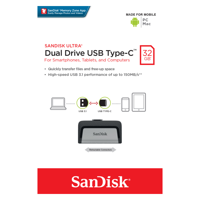 La SanDisk Ultra Dual Drive USB Type-C es imprescindible para quienes buscan rendimiento y versatilidad. Aquí te damos algunas razones: La combinación de USB Type-A y USB Type-C proporciona compatibilidad universal con casi todos los dispositivos. Con la versión 3.2 Gen 1 (3.1 Gen 1), los tiempos de espera son mínimos, gracias a una velocidad de lectura de hasta 150 MB/s. El factor de forma deslizante y su diseño ligero y compacto lo hacen perfecto para llevar a cualquier lugar. 32 GB de espacio, ideal para almacenar y transferir grandes cantidades de datos rápidamente. Funciona con una amplia gama de dispositivos, incluidos Mac y dispositivos móviles, ofreciendo un almacenamiento portátil y eficiente.
