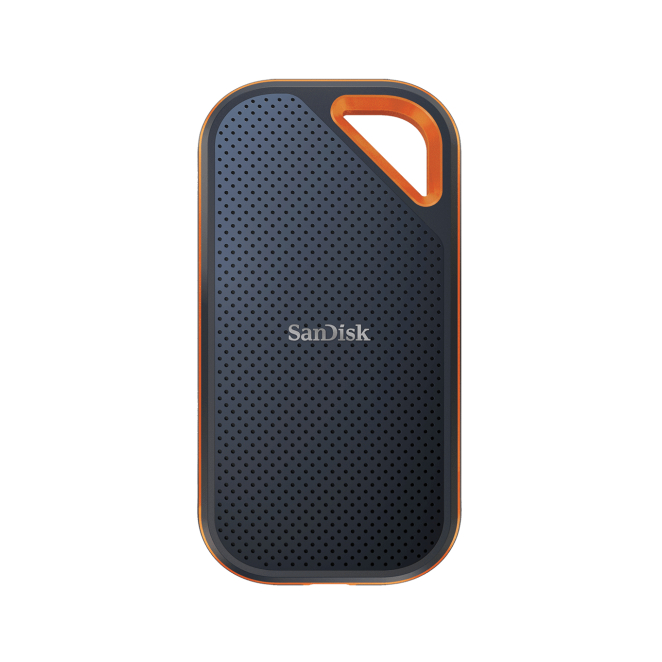 SanDisk Extreme PRO SSD de 4TB con conexión USB Tipo C 3.2 Gen 2, color negro y naranja. SKU SDSSDE81-4T00-G25