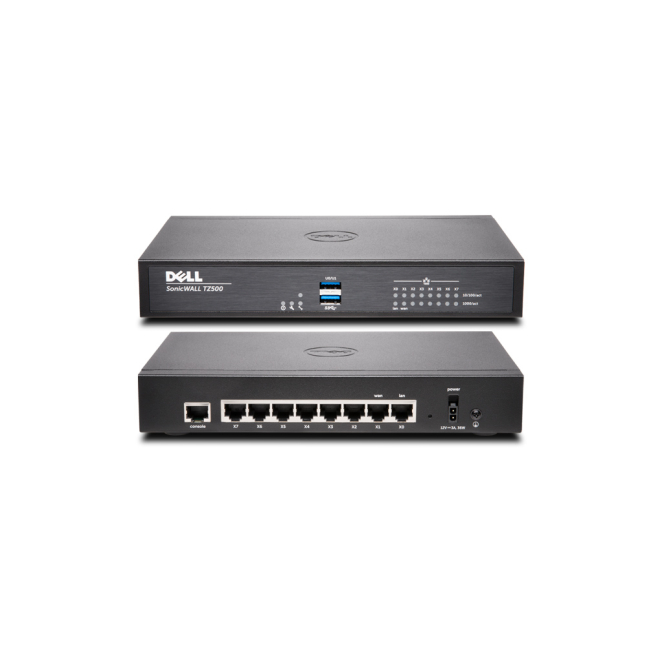 El SonicWall TZ500 cortafuegos (hardware) 1,4 Gbit/s cuenta con 9 puertos Ethernet LAN (RJ-45) y 2 puertos USB 2.0.