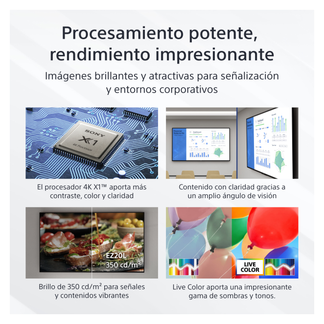 La Sony FW-43EZ20L es ideal para empresas que buscan una solución de señalización digital potente y versátil. Negocios retail, centros comerciales, hoteles y salas de conferencias pueden beneficiarse de esta pantalla gracias a su capacidad para funcionar hasta 16 horas al día, 7 días a la semana. La combinación de tecnologías avanzadas y facilidad de uso la hace perfecta para cualquier entorno comercial que necesite una pantalla de señalización pública.