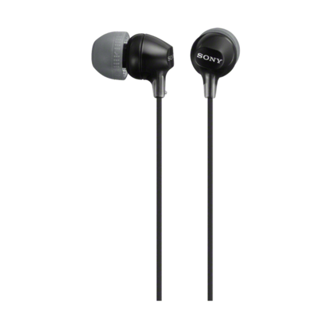 Auriculares intrauditivos Sony MDR-EX15AP con micrófono, cable plano y conector de 3.5mm. SKU: MDREX15APB.CE7
