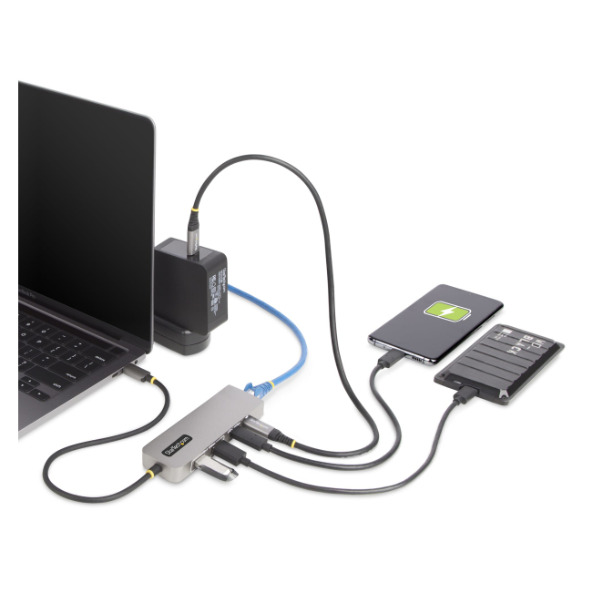 Alimente su portátil mientras utiliza el hub, asegurando un espacio de trabajo libre de desorden.