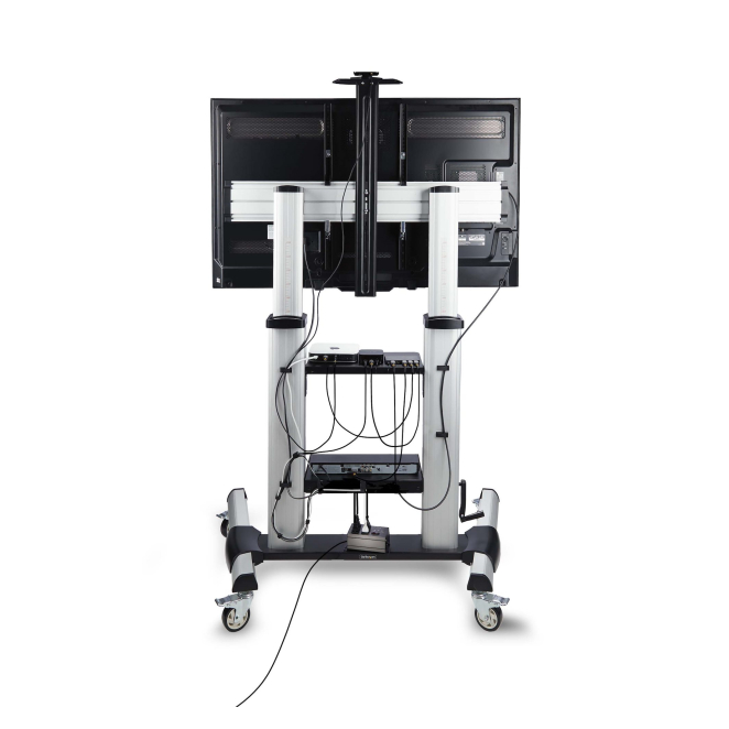 StarTech.com carrito soporte móvil con ruedas para TV de pantalla plana de 60 a 100 pulgadas, soporte rodante ajustable en altura para televisor LCD. SKU 1110C-MOBILE-TV-CART