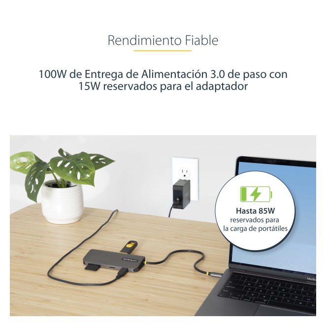 Sí, el adaptador soporta entrega de alimentación de hasta 100W, lo que permite cargar tu portátil mientras usas otros dispositivos conectados.