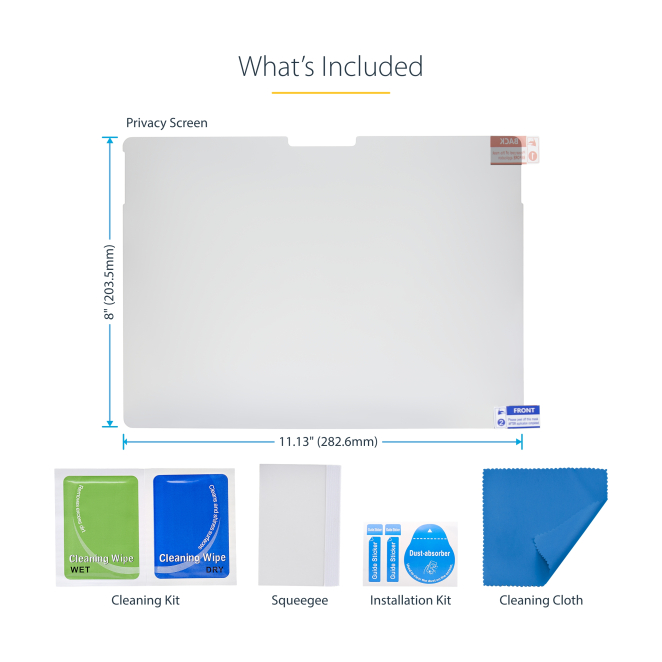 Aquí respondemos algunas de las preguntas más comunes sobre el StarTech.com Filtro de Privacidad Táctil de 4 Vías para Surface Pro 8/9/X: No, la instalación es muy sencilla. El producto incluye un kit de instalación y unas instrucciones paso a paso para asegurar una aplicación fácil y rápida. No, el StarTech.com Filtro de Privacidad Táctil de 4 Vías está especialmente diseñado para ser compatible con la funcionalidad táctil de Surface Pro, por lo que no afectará la respuesta táctil. El filtro está diseñado específicamente para los modelos Surface Pro 8, 9 y X de 13 pulgadas. No se garantiza la compatibilidad con otros dispositivos. Sí, el acabado mate antirreflejo del filtro reduce significativamente los reflejos, mejorando la visualización en condiciones de iluminación brillante. El StarTech.com Filtro de Privacidad Táctil de 4 Vías puede reducir hasta un 51% de la luz azul emitida por la pantalla, ayudando a disminuir la fatiga ocular. Material Plástico Tamaño máximo de pantalla 13 " Material Plástico Material Plástico Marca compatible Microsoft Compatibilidad Surface Pro 8/9/X Ancho 283 mm Profundidad 204 mm Altura 0.4 mm Peso 100 g Peso del paquete 184 g Profundidad del paquete 245 mm Ancho del paquete 390 mm Altura del paquete 4 mm