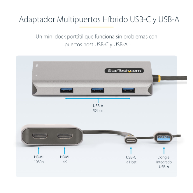 StarTech.com adaptador multipuertos USB-C con HDMI doble (4K30Hz/1080p60Hz), hub ladrón 3 USB-A y mini docking station de viajes con cable integrado de 40cm, SKU 167B-USBC-MULTIPORT.