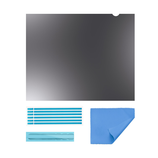 El paquete incluye el filtro de privacidad, tiras adhesivas transparentes, pestañas de montaje deslizante y un paño de limpieza para mantener su filtro en perfectas condiciones.