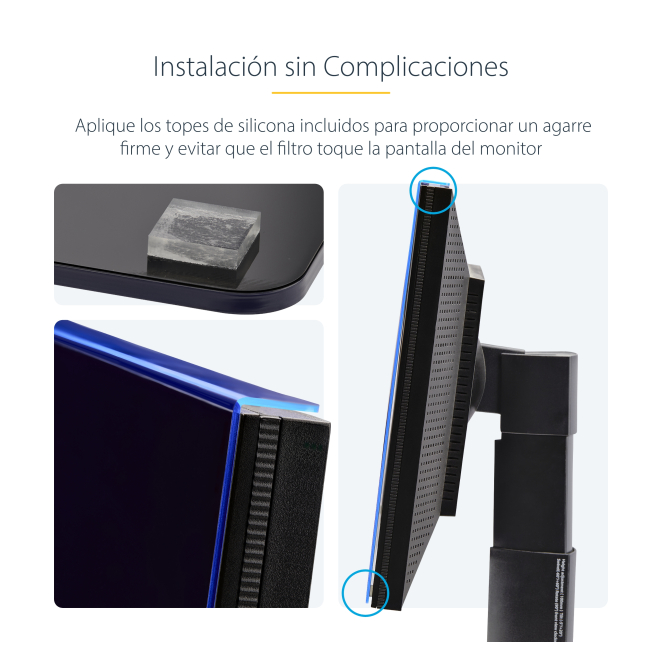 El filtro se instala fácilmente colgándolo en el borde superior de tu monitor de 24 pulgadas. Los topes de silicona incluidos aseguran una fijación segura sin dañar la pantalla.