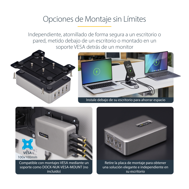 - Ideal para espacios de trabajo y educativos: Gestión eficiente de cables y múltiples dispositivos.