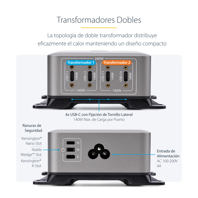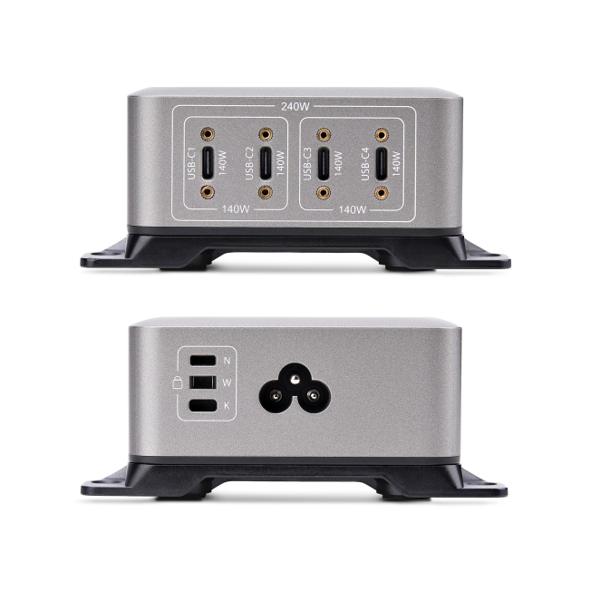 StarTech.com Cargador USB-C de 4 Puertos – Cargador USB Tipo C – Cargador para Portátil – Cargador para Móvil – Un Puerto 140W EPR – PD 3.1 – con Tornillos de Fijación – Total 240W