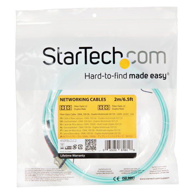 Cable de fibra óptica multimodo de StarTech.com de 2 metros LC/UPC a LC/UPC con especificaciones OM4 50/125µm para redes de 100G y cubierta LSZH. SKU: 450FBLCLC2
