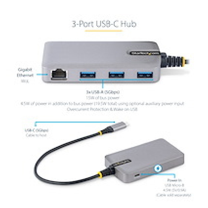 StarTech.com Hub USB-C con 3 Puertos USB-A, USB 3.0 de 5Gbps, alimentado por el bus y red Ethernet RJ45 Gigabit, SKU 5G3AGBB-USB-C-HUB