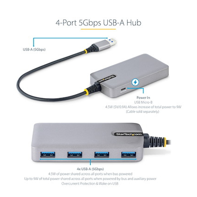 StarTech.com Hub USB de 4 Puertos – USB 3.0 de 5Gbps – Alimentado por el Bus – Concentrador de 4 Puertos USB-A con Alimentación Opcional – Ladrón USB Portátil – Cable 30cm