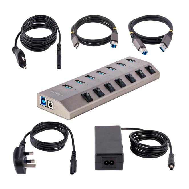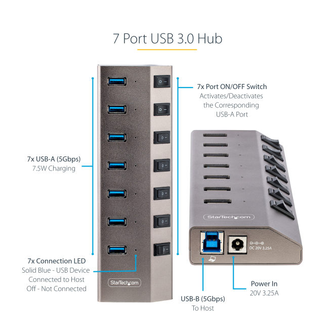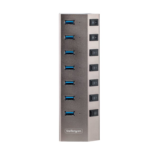 StarTech.com Hub USB-C autoalimentado con 7 puertos USB 3.0, interruptores individuales, fuente de alimentación y velocidad de transferencia de 5 Gbps. SKU: 5G7AIBS-USB-HUB-EU.
