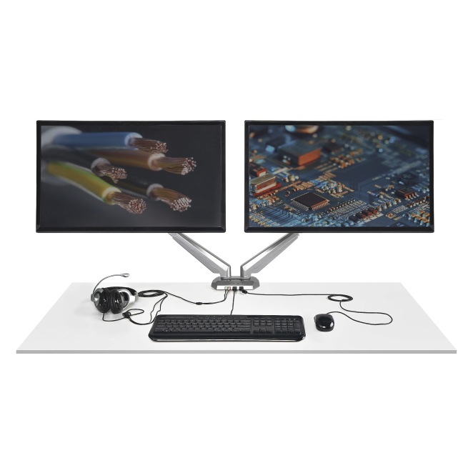 La usabilidad del Brazo de Soporte para 2 Monitores StarTech.com es impresionante gracias a su diseño ergonómico y ajustable. Los brazos articulados permiten movimientos de inclinación, giro y rotación para colocar tus monitores exactamente donde los necesitas. La instalación es sencilla, con todos los tornillos y herramientas incluidos, lo que facilita un ajuste rápido y seguro. La inclusión de puertos USB y de audio directamente en la base del brazo mejora la conectividad y comodidad.