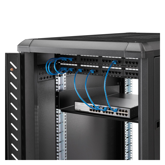 Con una capacidad de hasta 23 kg, este estante puede albergar diversos equipos y accesorios no montables en rack.
