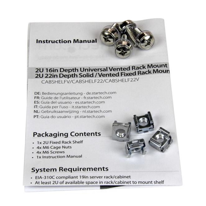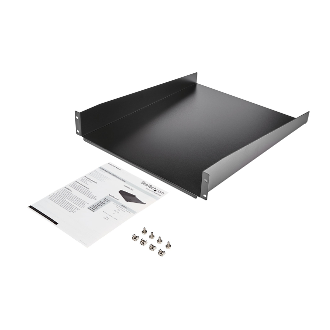 El paquete del StarTech.com Estante Bandeja 2U incluye una guía de instalación rápida y todos los tornillos y tuercas necesarios para su instalación.