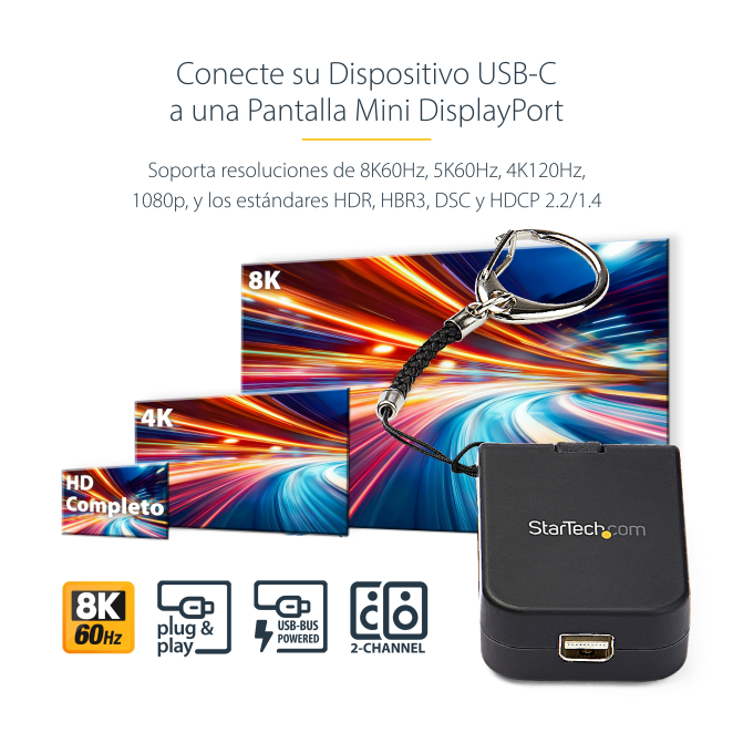 El StarTech.com Adaptador Convertidor Compacto USB C a Mini DisplayPort es la solución ideal para quienes buscan alta calidad en sus conexiones de video. Este conversor USB Tipo C a mDP es capaz de soportar resoluciones 8K a 60Hz y 4K con HDR, gracias a su compatibilidad con el estándar DisplayPort 1.4 y Thunderbolt 3. Además, su diseño compacto con un llavero desmontable asegura una portabilidad extrema, perfecto para usuarios en movimiento. No importa si eres un profesional que necesita llevar presentaciones de alta calidad a cualquier lugar o un entusiasta del entretenimiento en casa, el StarTech.com adaptador USB C a Mini DisplayPort ofrece conectividad flexible y confiable.