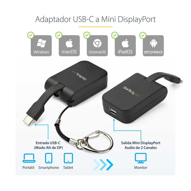 El paquete incluye el adaptador compacto USB-C a Mini DisplayPort con un llavero desmontable para facilitar su portabilidad.