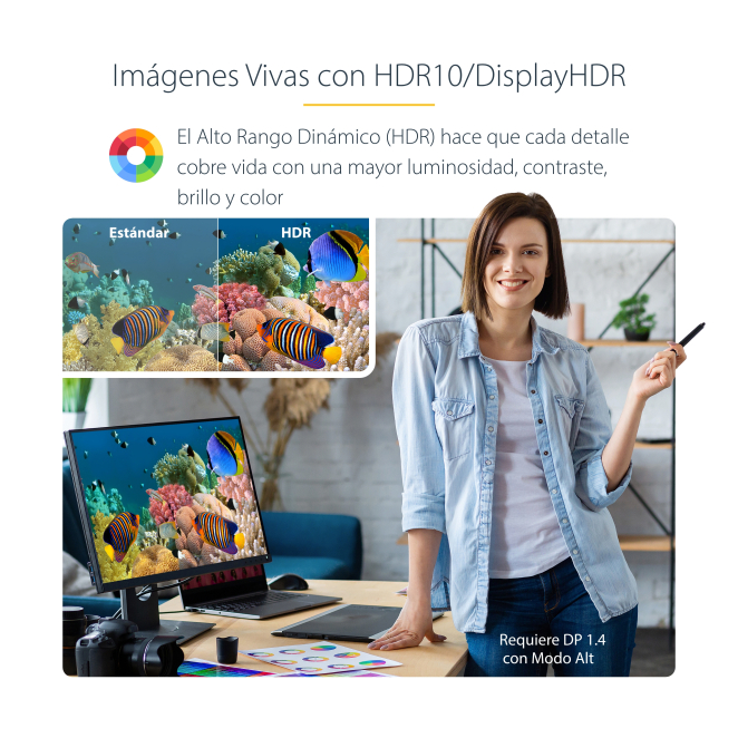- Conectividad Simplificada: Plug-and-play con dispositivos USB-C y Thunderbolt 3 sin necesidad de instalar software adicional.