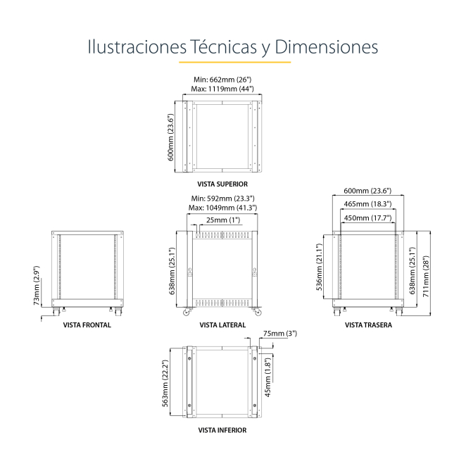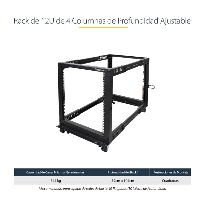 Flexibilidad y ajuste: La posibilidad de ajustar la profundidad de montaje entre 22″ y 40″ permite adaptar el rack a distintos equipos.