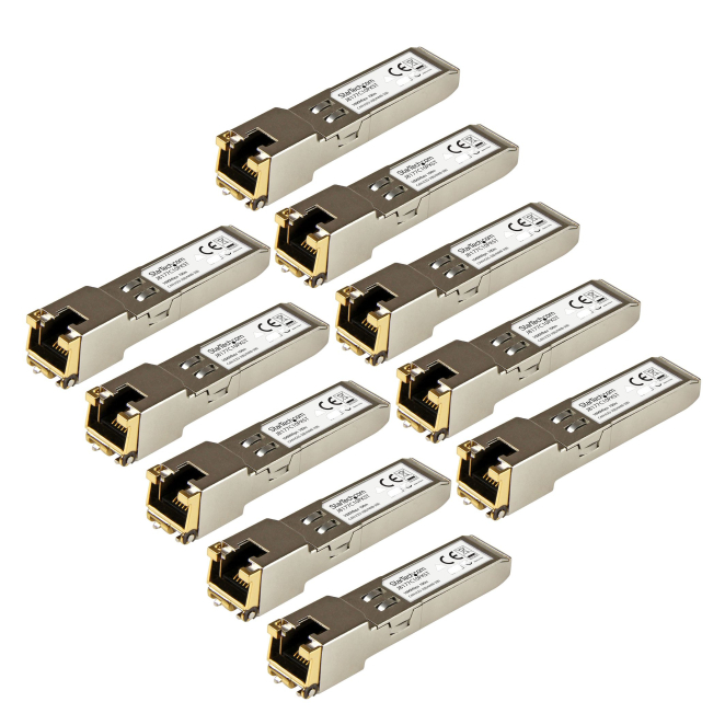StarTech.com Paquete de 10 Módulos Transceptores SFP compatibles con HPE J8177C. Ofrecen conectividad Ethernet Gigabit de 1GbE mediante SFP a RJ45 Cat6/Cat5e. SKU: J8177C10PKST.