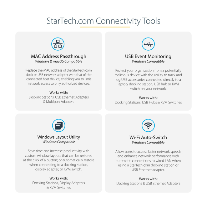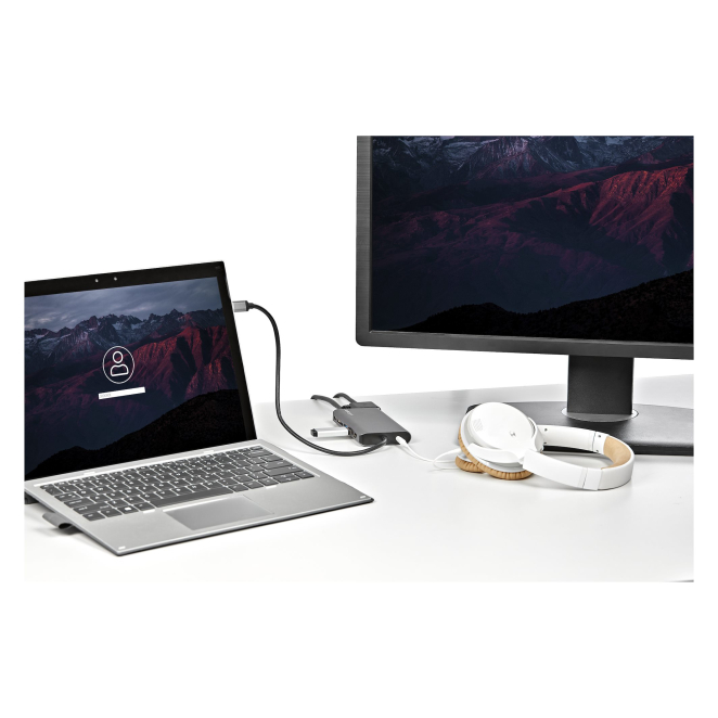 Aquí hay algunas preguntas comunes sobre el StarTech.com adaptador multipuertos USB-C: Sí, el adaptador es compatible con cualquier dispositivo que tenga un puerto USB-C, incluyendo MacBooks, Chromebooks, dispositivos Windows y algunos modelos de Android. Sí, gracias a su soporte para Power Delivery de hasta 100W, puede alimentar y cargar el portátil y otros periféricos simultáneamente. No, el adaptador permite una conexión de video a la vez; puede usar ya sea el puerto HDMI o el puerto VGA, pero no ambos al mismo tiempo. Sí, el puerto Ethernet soporta conexiones Gigabit, ofreciendo una red estable y rápida para transferencia de datos y acceso a internet. El adaptador funciona plug-and-play sin necesidad de software adicional. Sin embargo, puedes mejorar su funcionalidad con las Herramientas de Conectividad de StarTech.com, disponibles para descarga. Tecnología de conectividad Alámbrico Interfaz de host USB 3.2 Gen 1 (3.1 Gen 1) Type-C Color del producto Negro, Gris Certificación CE, FCC, REACH Sistema operativo Windows soportado Windows 10, Windows 10 Education, Windows 10 Education x64, Windows 10 Enterprise, Windows 10 Enterprise x64, Windows 10 Home, Windows 10 Home x64, Windows 10 IOT Core, Windows 10 IoT Enterprise, Windows 10 Pro, Windows 10 Pro x64, Windows 10 x64, Windows 11, Windows 11 x64, Windows 7, Windows 7 Enterprise, Windows 7 Enterprise x64, Windows 7 Home Basic, Windows 7 Home Basic x64, Windows 7 Home Premium, Windows 7 Home Premium x64, Windows 7 Professional, Windows 7 Professional x64, Windows 7 Starter, Windows 7 Starter x64, Windows 7 Ultimate, Windows 7 Ultimate x64, Windows 7 x64, Windows 8, Windows 8 Enterprise, Windows 8 Enterprise x64, Windows 8 Pro, Windows 8 Pro x64, Windows 8 x64 Sistema operativo MAC soportado Mac OS X 10.11 El Capitan, Mac OS X 10.12 Sierra, Mac OS X 10.13 High Sierra, Mac OS X 10.14 Mojave, Mac OS X 10.15 Catalina, Mac OS X 11.0 Big Sur, Mac OS X 12.0 Monterey, Mac OS X 13.0 Ventura Intervalo de temperatura operativa 0-45 °C Intervalo de temperatura de almacenaje -10-82 °C Intervalo de humedad relativa para funcionamiento 5-90 % Ancho 61 mm Profundidad 460 mm Altura 15 mm Peso 125 g Ancho del paquete 145 mm Profundidad del paquete 117 mm Altura del paquete 30 mm Peso del paquete 190 g Certificados de conformidad RoHS Guía de configuración rápida Sí
