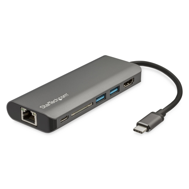 Adaptador Multipuertos USB-C StarTech con HDMI 4K, lector de tarjetas SD/SDHC, y 2 puertos USB 3.0, SKU DKT30CSDHPD3