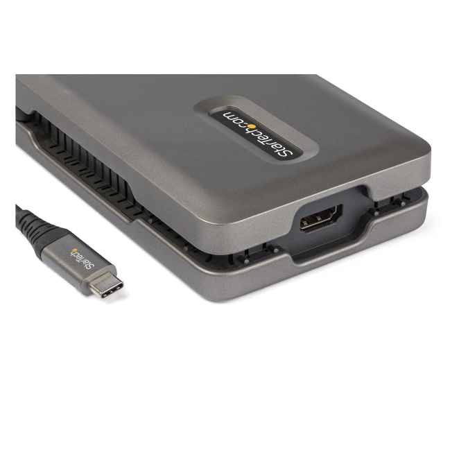 El adaptador multipuertos USB-C de StarTech.com es una solución completa para expandir la conectividad de tu portátil o tablet USB-C. Este adaptador no solo ofrece una salida de vídeo HDMI 4K a 60Hz, sino que también cuenta con dos puertos USB 3.2 Gen 2, un lector de tarjetas SD/MicroSD y un puerto Gigabit Ethernet. Además, con PD de Paso de hasta 100W, se asegura de que tus dispositivos siempre estén cargados y listos para usarse. Gracias a su tamaño compacto pero robusto, el StarTech.com Adaptador Multipuertos USB-C transforma tu dispositivo en una potente estación de trabajo.