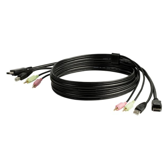 Imagen del cable conmutador KVM USB DisplayPort de StarTech.com con 4 en 1, audio y micrófono, y 6 pies de longitud. SKU: DP4N1USB6