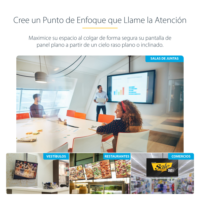 El StarTech.com Soporte de Techo para TV es ideal para una variedad de usuarios que buscan aprovechar al máximo su espacio disponible. Es perfecto para oficinas, salas de reuniones y vestíbulos de edificios corporativos, donde mantener una apariencia ordenada es crucial. Además, los entusiastas del cine en casa encontrarán en este soporte una excelente opción para crear una experiencia de teatro personal, sin obstrucciones. También es una solución práctica para bares y restaurantes que necesitan visibilidad máxima en sus televisores para clientes sentados en diferentes ángulos.