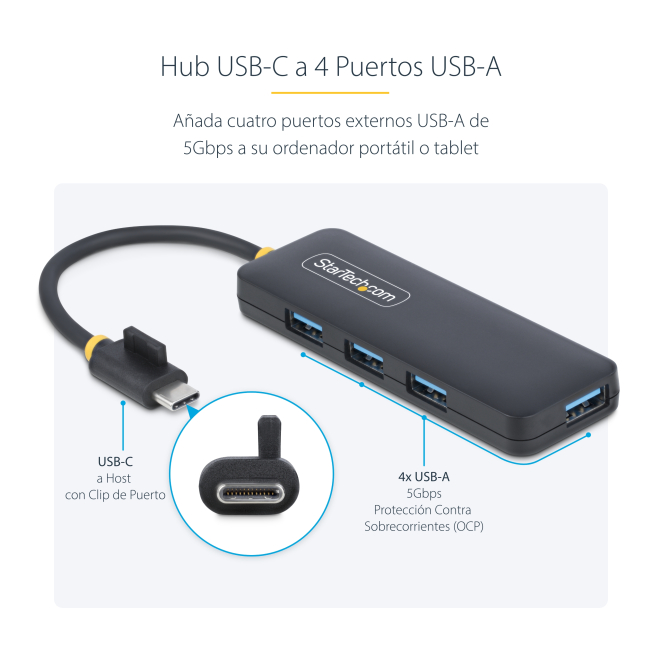StarTech.com Hub USB-C de 4 Puertos – Ladrón USB Tipo C a 4 Puertos USB-A – Alimentado por el Bus – USB 3.0 de 5Gbps – Hub Portátil USB para Viajes – Protección de Sobrecorriente
