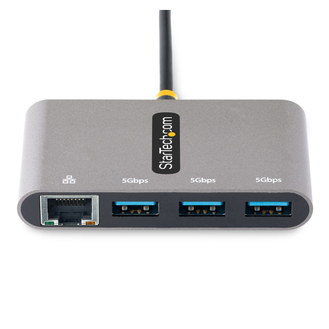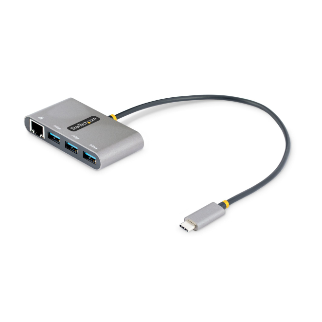 StarTech.com Adaptador USB-C con Ethernet, 3 Puertos USB-A de 5Gbps, modelo HB30C3A1GEA2. Incluye cable de 30cm y es alimentado por el bus.