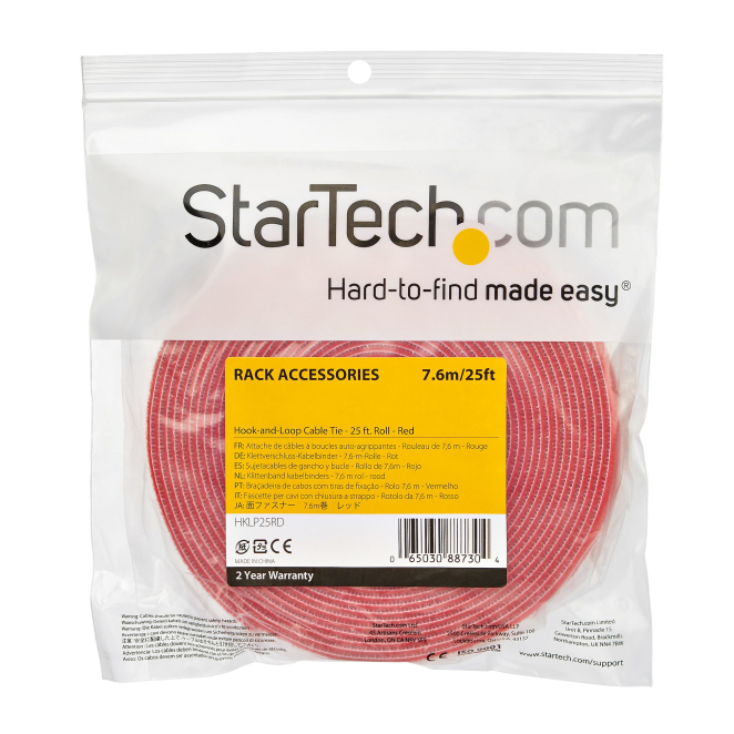 Bobina roja de 7,6 metros de cinta reutilizable de gancho y bucle StarTech para gestión de cables. SKU HKLP25RD