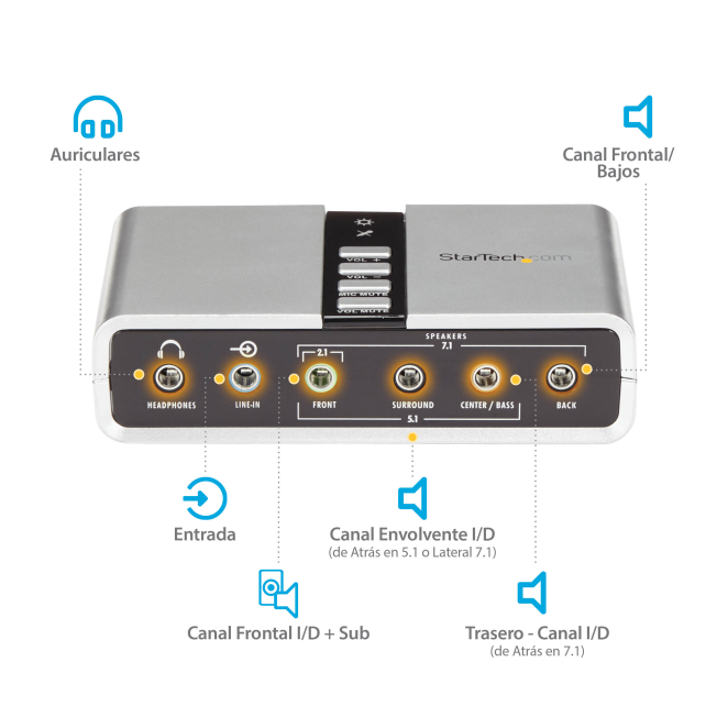 StarTech.com Tarjeta de Sonido 7,1 USB Externa conexiones