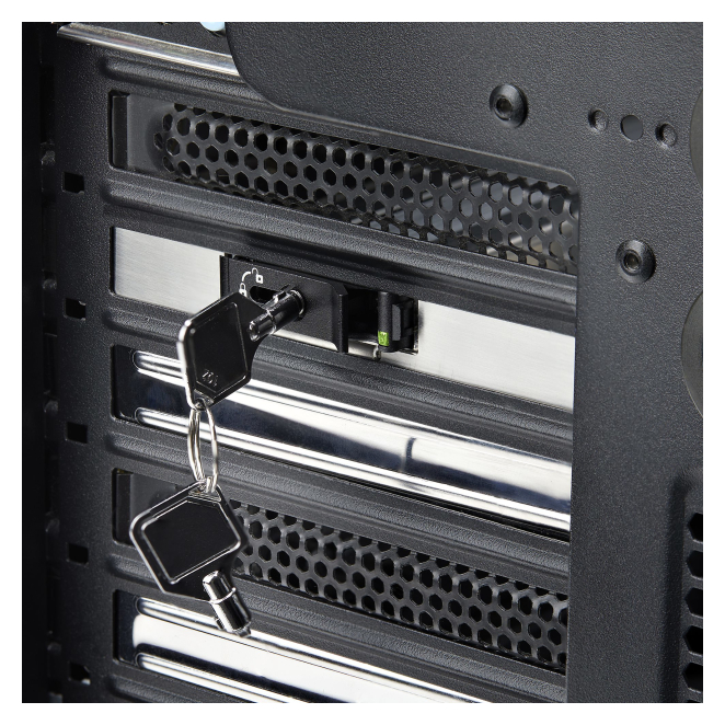 Sí, la tarjeta incluye un mecanismo de bloqueo con llaves para asegurar sus unidades SSD contra accesos no autorizados.