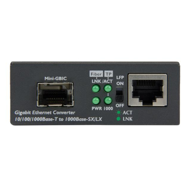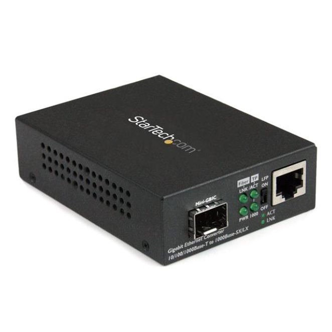 El StarTech.com Conversor de Medios Ethernet Gigabit a Fibra con SFP abierto es un dispositivo que convierte conexiones Ethernet por cable de cobre RJ45 en conexiones Gigabit por fibra óptica.