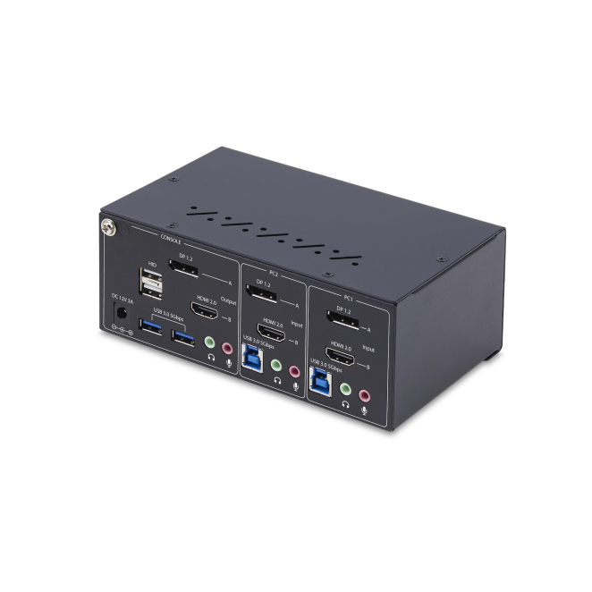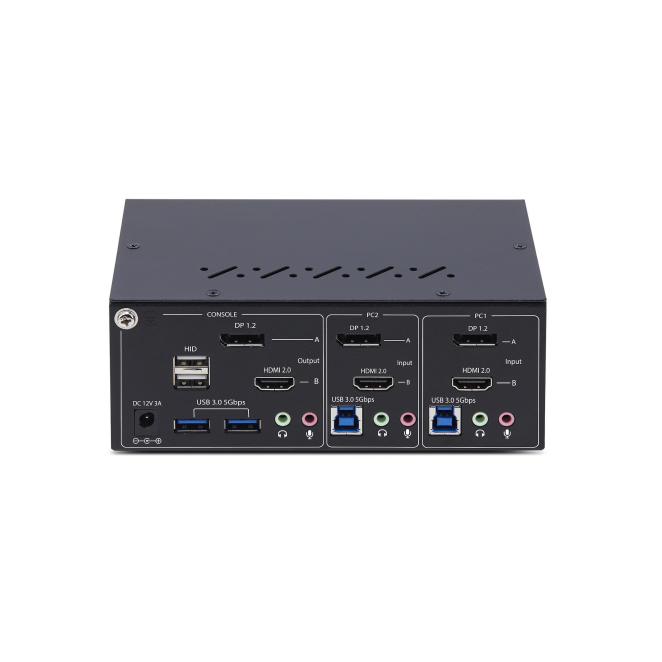 El conmutador KVM admite dos monitores (HDMI y DisplayPort), permitiendo una configuración flexible adaptada a tus necesidades específicas.