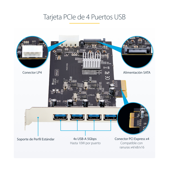 La StarTech.com Tarjeta PCI Express de 4 Puertos USB-A se destaca por muchas razones. A continuación, se detallan algunas de las principales:
