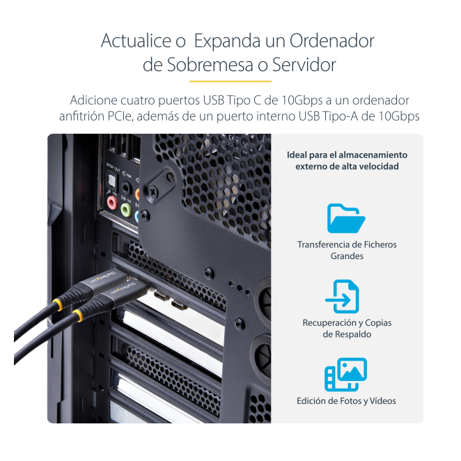 La StarTech.com Tarjeta PCIe de 5 Puertos USB de 10Gbps es ideal para **usuarios avanzados** y **profesionales** que requieren una alta **capacidad de transferencia de datos**. También es perfecta para **entusiastas de la tecnología**, **creadores de contenido** y **editores de video** que necesitan transferir grandes archivos multimedia de manera rápida y eficiente. Por otro lado, las empresas que dependen de múltiples conexiones USB para sus operaciones diarias encontrarán en esta tarjeta una solución fiable y versátil. Ya sea que estés utilizando un **PC de escritorio, un servidor** o cualquier otro dispositivo compatible con PCIe, esta tarjeta ofrece una mejora significativa en la conectividad y el funcionamiento.