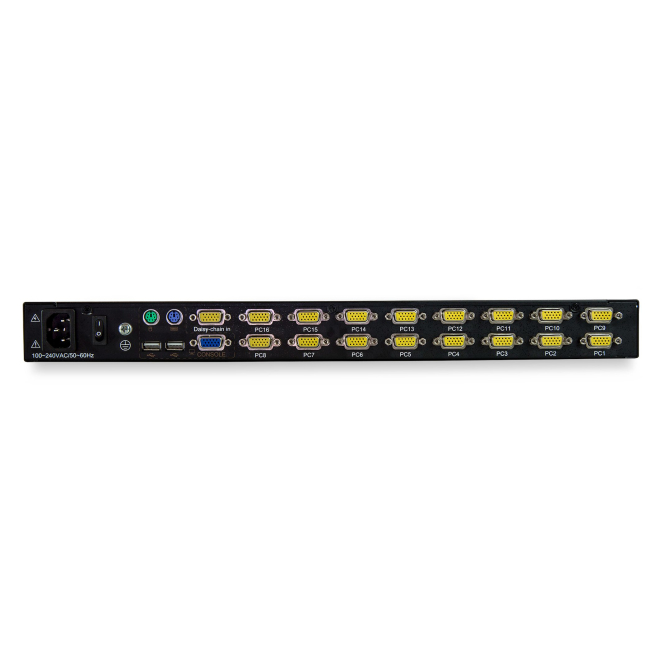 La Consola KVM de 16 Puertos para Montaje en Rack incluye puertos VGA (D-Sub) y PS/2 para teclado y ratón.