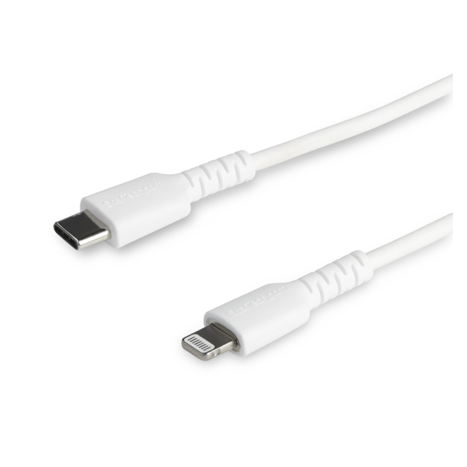 Cable StarTech.com Resistente USB-C a Lightning 1 m en color blanco, compatible con iPad y iPhone 12, fibra de aramida y certificado MFi. SKU: RUSBCLTMM1MW