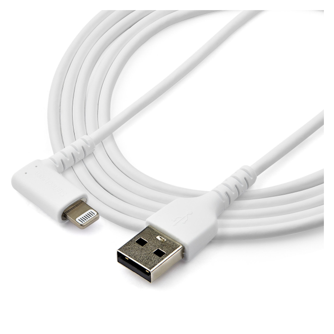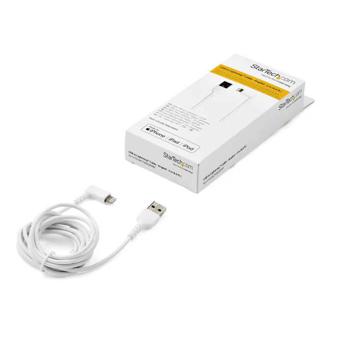 StarTech.com Cable Resistente USB-A a Lightning de 2 m – Blanco -Acodado en un Ángulo de 90° a la Derecha – Cable de Carga y Sincronización USB Tipo A a Lightning de Fibra de Aramida Resistente – MFi – iPhone