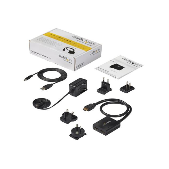 Aquí tienes algunas de las preguntas más frecuentes sobre el StarTech.com Multiplicador de Vídeo HDMI de 2 Puertos: Sí, es completamente compatible con resoluciones 1080p y 720p, lo que lo hace muy versátil para diferentes tipos de dispositivos y necesidades. No, el producto puede ser alimentado directamente desde un puerto USB cercano, aunque también incluye un adaptador de corriente por si prefieres utilizarlo. Sí, el producto es compatible con video 3D, ofreciendo una experiencia de visualización avanzada e inmersiva. El multiplicador es compatible con una amplia gama de dispositivos HDMI como computadoras, reproductores Blu-ray y terminales para TV por cable. Puedes conectar hasta dos pantallas HDMI al mismo tiempo, compartiendo así el contenido de una sola fuente en ambas. Color del producto Negro Corriente de entrada 0.5 A Voltaje de entrada AC 100-240 V Ancho 50 mm Peso 235 g Profundidad 620 mm Altura 18 mm Cables incluidos USB Manual de usuario Sí Ancho del paquete 230 mm Profundidad del paquete 156 mm Altura del paquete 56 mm Peso del paquete 396 g Certificación REACH, FCC, CE Certificados de conformidad RoHS
