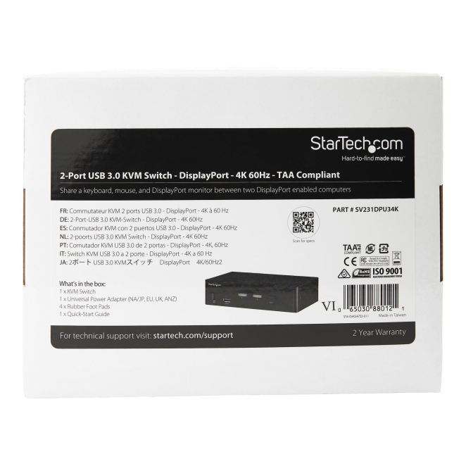 Estas son algunas preguntas comunes sobre el StarTech.com Switch Conmutador KVM de 2 Puertos DisplayPort: El StarTech KVM DisplayPort es compatible con Windows, Mac y Linux, ofreciendo una amplia gama de opciones de usabilidad. El StarTech.com Switch KVM 4K soporta una resolución máxima de 3840 x 2160 a 60Hz. Sí, el hub USB 3.0 integrado permite compartir periféricos adicionales entre los dispositivos conectados. Sí, el StarTech.com Switch KVM soporta tanto audio digital como analógico. Sí, incluye una guía de instalación rápida y los botones del panel frontal permiten un cambio de sistema sencillo. Número de computadoras controladas 2 Tipo de puerto de teclado USB Tipo de puerto de ratón USB Tipo de puerto de vídeo DisplayPort Conexión de audio Sí Máxima resolución 3840 x 2160 Pixeles Color del producto Negro Indicadores LED Si Certificación CE, FCC, TAA, REACH Pantalla incorporada No Voltaje de entrada 100 - 240 V Adaptador de energía externo Sí Intervalo de temperatura operativa 0-40 °C Intervalo de temperatura de almacenaje -10-60 °C Intervalo de humedad relativa para funcionamiento 0-80 % Ancho 160 mm Peso 1100 g Profundidad 100 mm Altura 40 mm Adaptador AC incluido Sí Ancho del paquete 189 mm Profundidad del paquete 238 mm Altura del paquete 91 mm ¿Tienes dudas sobre qué producto elegir?