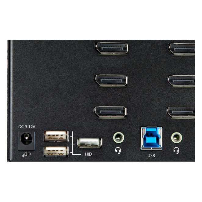 Este conmutador KVM cuenta con 12 puertos DisplayPort, permitiendo la conexión y gestión de hasta cuatro monitores por computadora.